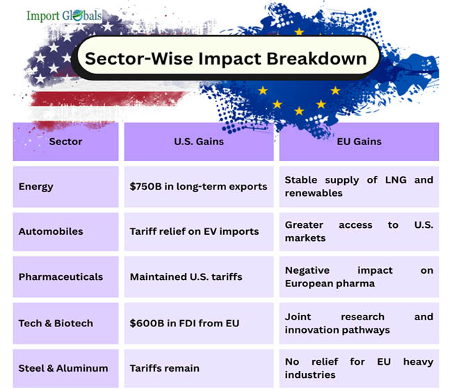 For American energy companies, the $750 billion energy component is revolutionary. In many European markets, it solidifies the United States' position as the continent's main supplier of fossil fuels and LNG, displacing Russia and the Middle East. Based on USA Export Data by Import Globals, over the following two years, U.S. energy exports by volume are also predicted to rise by 15–20% as a result of this.