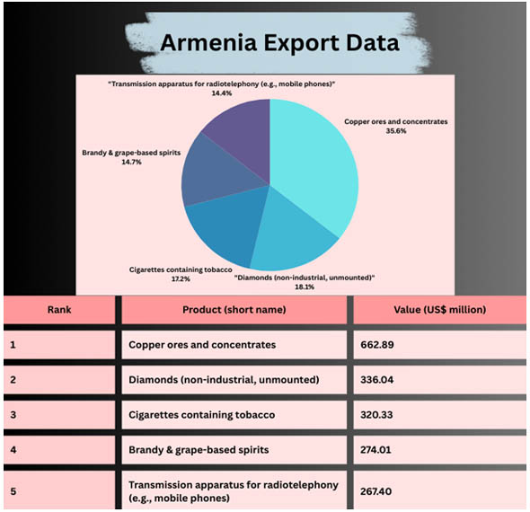 Armenia imports energy, is landlocked, and is heavily susceptible to commerce. This implies that due to limited local refining capability and fundamental energy supplies, natural gas and refined petroleum are nearly always among its top import lines. However, based on Armenia Import Data by Import Globals, the nation has gained a competitive edge in some export markets, including tobacco and branded drinks, precious metals and stones, copper ore from well-established mines, and, more recently, telecom equipment and electronics that frequently represent value-added distribution and transshipment. The end product is a portfolio that includes "traditional" mining and food and drink items with more contemporary, high-tech goods and reexports that are transported via Armenia's transportation networks.