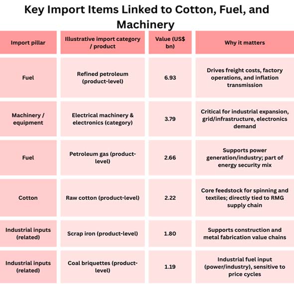 Bangladesh's reliance on cotton, fuel, and machinery for imports (2025–26)