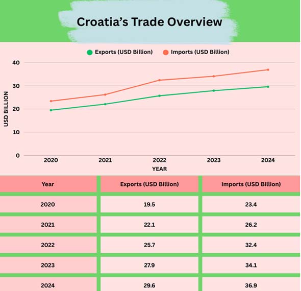 Croatia's trade continued to increase steadily from 2020 to 2024. According to Import Globals' Croatia Import Export Trade Data, exports went up by more than $10 billion, and imports went up by more than $13 billion. This is because of the growing demand for energy and technology. The growing trade imbalance shows how much Croatia relies on imported energy, while expanding exports demonstrate that the country is strong in medicines, equipment, and processed commodities.