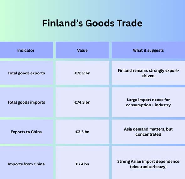 Finland is a classic “small, open economy”: it relies on international trade to sustain industrial output, employment, and investment. But Finland’s trade relationships are not evenly spread across the world.