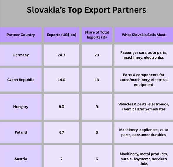 Concentration of Demand: As per Germany Import Export Trade Analysis by Import Globals, heavy dependence on Germany (and cars in particular) makes cyclical swings worse. Slovak factories and suppliers could be hurt by a long-term drop in German vehicle exports or a technology shift that causes problems.