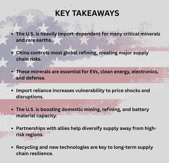 This blog talks about how the U.S. needs to import rare earths and key minerals, the risks that come with this, and how the U.S. is protecting its weak supply chains through reshoring, alliances, recycling, and new technologies.