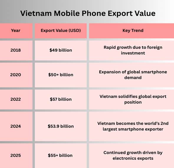 Ans. Vietnam exported approximately $53.9 billion in phones and components in 2024, making it the second-largest exporter of smartphones.