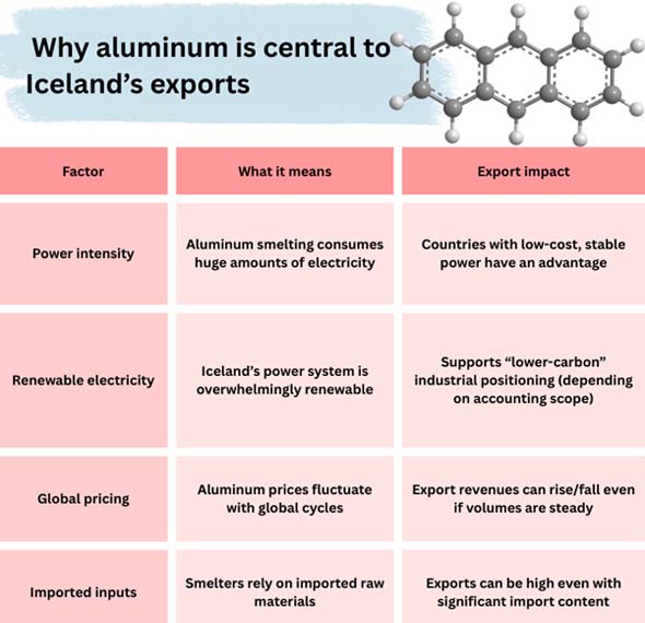 At first glance, aluminum looks like an odd fit for a country known for glaciers, volcanoes, and fishing. But aluminum is one of Iceland’s most logical export products because aluminum smelting is electricity-intensive, and Iceland produces electricity almost entirely from renewable sources.