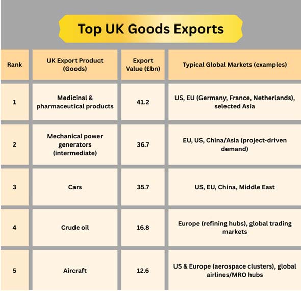 The UK's top goods exports are large and specialized, and they compete on quality, compliance, and built-in knowledge (research and development, design, and engineering).