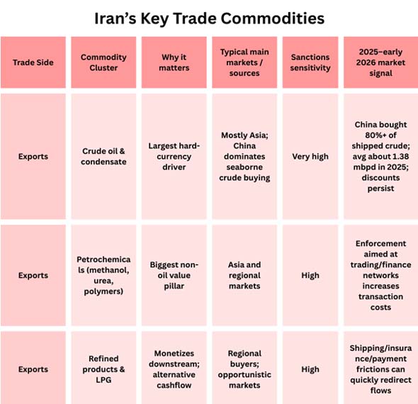 The easiest way to understand Iran's commerce with other countries in 2025–26 is to think of it as two economies moving in the same direction. One is the energy and commodities engine (crude, condensate, refined goods, petrochemicals, metals) that creates money and keeps industry going.