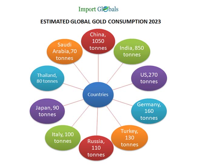 The overgrowing global population demands higher consumption of gold as jewelry and a matter of investment for financial stability. The global rate of gold consumption has attained a rapid hike from the past consecutive years; the estimated multinational gold consumption of the top 10 countries in the year 2023 is discussed below,