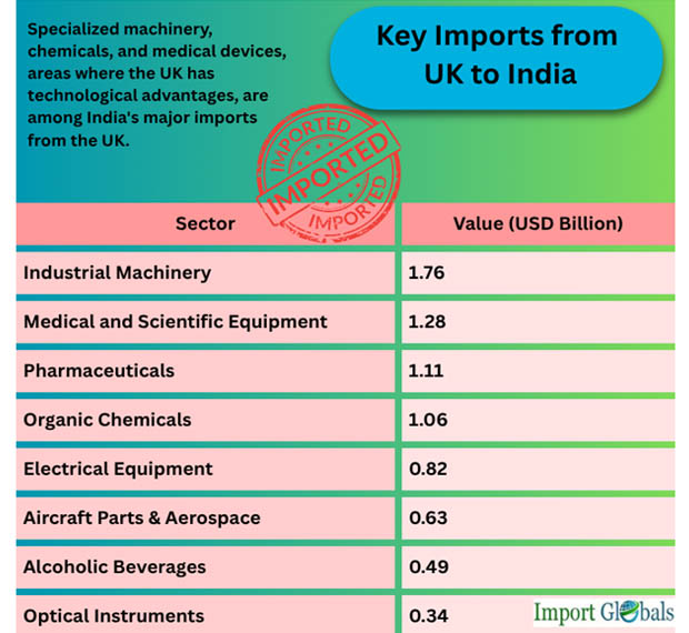 India imports specialized commodities and high-tech products to enhance its indigenous capabilities. As per United Kingdom Import Custom Data by Import Globals, specialized machinery, chemicals, and medical devices, areas where the UK has technological advantages, are among India's major imports from the UK. India's demand for high-end engineering and medical components, sophisticated R&D inputs, and precise tools is reflected in the import trend. These products directly support India's Made in India campaigns and domestic modernization efforts.