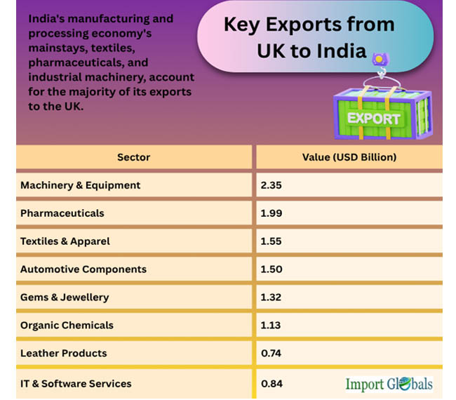 India exports a wide range of goods to the UK in the consumer, industrial, and technology sectors. India's manufacturing and processing economy's mainstays, textiles, pharmaceuticals, and industrial machinery, account for the majority of its exports to the UK. According to India Import Export Trade Data by Import Globals, because of their competitive pricing and adherence to international standards, pharmaceuticals continue to be a stronghold. While textiles and diamonds contribute historic value, the export of electrical equipment and automobile components indicates a rising synergy in industrial collaboration.