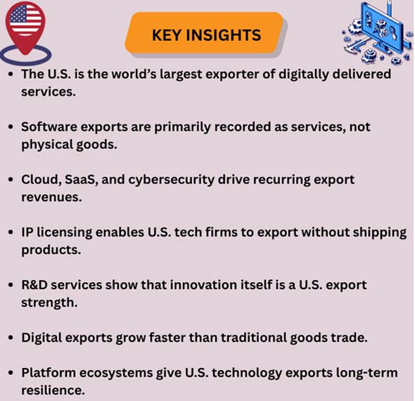 This change has made technology and software a key part of the U.S. export strength, especially through cross-border services like cloud computing, IT consulting, licensing intellectual property, and research-driven innovation.It's not just one type of technology that makes U.S. exports so strong; it's a whole ecosystem. A U.S. company might design semiconductors in the U.S., host services in global cloud regions, license IP to partners in other countries, and offer remote cybersecurity monitoring to clients throughout the world. These services are often all part of the same business partnership. This export engine is also strong.