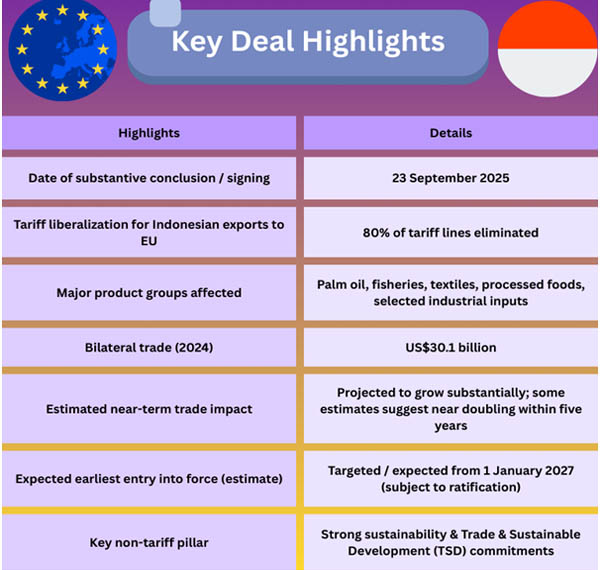 The most intriguing component is that tariffs will be lifted on roughly 80% of Indonesian exports to the EU (by tariff lines). This includes palm oil, seafood, textiles, and certain processed goods. According to Europe Export Data by Import Globals, from the European Commission and Indonesia, the CEPA is a package that combines market access, investment protection, and a big framework for sustainable trade that aims to safeguard the environment, control deforestation, and raise labor standards. Official statements also say that commerce between the EU and Indonesia, which is estimated to be about US$30.1 billion in 2024, will expand a lot. Some estimates say that it will almost double within five years of the deal going into effect.