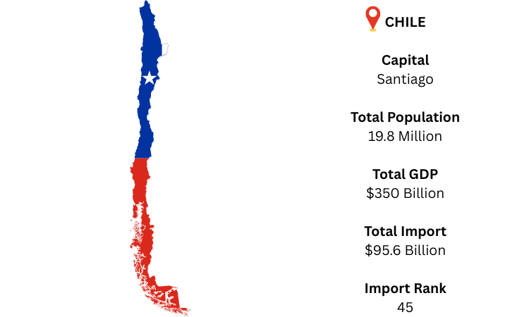 The Pacific Ocean borders Chile to the west, Argentina to the east, Bolivia to the northeast, and Peru to the north. Chile is a long, thin country that stretches along the western coast of South America. Santiago is the largest city and capital of the nation. Chile's GDP is expected to reach around USD 350 billion in 2024. Chile is the 45th greatest importer in the world, based on statistics on international commerce. In 2024, China will be Chile's biggest exporter. In 2024, as per Chile import data, the nation's total imports are projected to amount to USD 95.6 billion. Refined petroleum continues to be Chile's largest import among all the goods it imports.