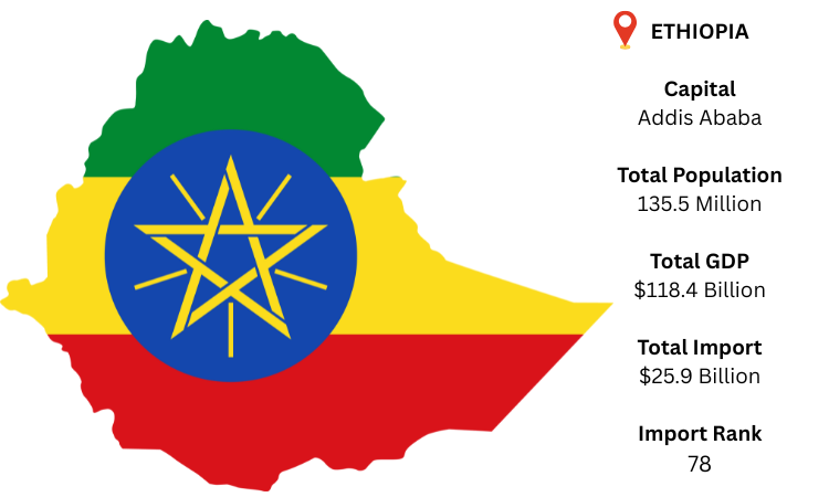 Ethiopia is a landlocked country situated in the Horn of Africa, bordered by Eritrea, Djibouti, Somalia, Kenya, South Sudan, and Sudan. Addis Ababa is both its capital and largest city, serving as the country's political and economic center. In 2024, Ethiopia's GDP is estimated at USD 118.4 billion. The nation ranks as the 78th-largest importer in the world. According to the Ethiopia import data, China is the largest exporter to Ethiopia. Ethiopia's total import value in 2024 is projected to reach around USD 25.9 billion, showcasing its growing demand for machinery, fuel, pharmaceuticals, and food items. The most important product of Ethiopia is refined petroleum, critical to fueling its transportation and power sectors.