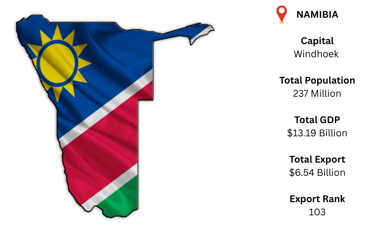 As per Namibia export dataSouth Africa is the top export destination, receiving 27.64% of Namibia’s exports in 2024 (USD 2.2 billion). Major exports include diamonds, copper, and meat products, reflecting Namibia’s mining-driven economy and regional trade alignment.