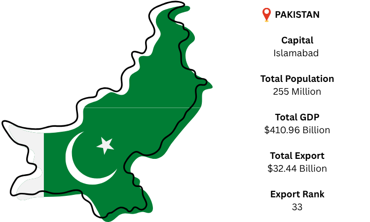 Pakistan is a South Asian country with a coastline that stretches along the Arabian Sea and borders China, India, Afghanistan, and Iran. Islamabad serves as its capital. Pakistan's GDP was around USD 410.96 billion in FY 2024. As per Pakistan export data, with a total export value of nearly USD 32.44 billion in 2024, Pakistan is ranked roughly 33rd in the world. With USD 9.28 billion (28.6%) in exports, textiles continue to be its largest export industry, particularly clothing items. The United States is its primary export market, with China and the United Kingdom coming in second and third.