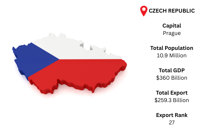 The Czech Republic ranks 27th globally for export volume, thanks to its robust manufacturing and industrial output.