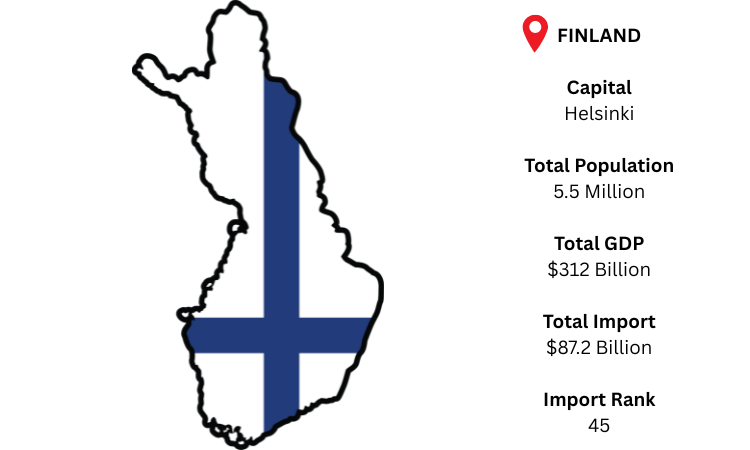 Finland is a Northern European nation renowned for its sophisticated infrastructure, strong trade network, and advanced economy. The capital, Helsinki, is the center of the nation's trade, industry, and politics. As per Finland import data, Finland, which has a population of over 5.5 million and a GDP of almost USD 312 billion, imported about USD 87.2 billion in total in 2024.