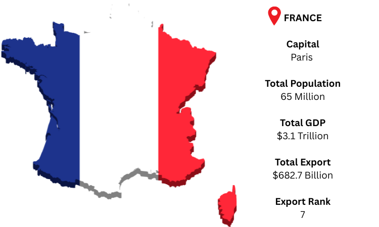 One of the top exporting countries in the world, France is renowned for high-end items such luxury goods, automobiles, airplanes, and medications. The capital, Paris, is a major center for international trade, innovation, and industry. As per France export data, with a population of around 65 million and a GDP of over USD 3.1 trillion, France is expected to rank among the top 10 exporters in the world with total exports of USD 682.7 billion in 2024.