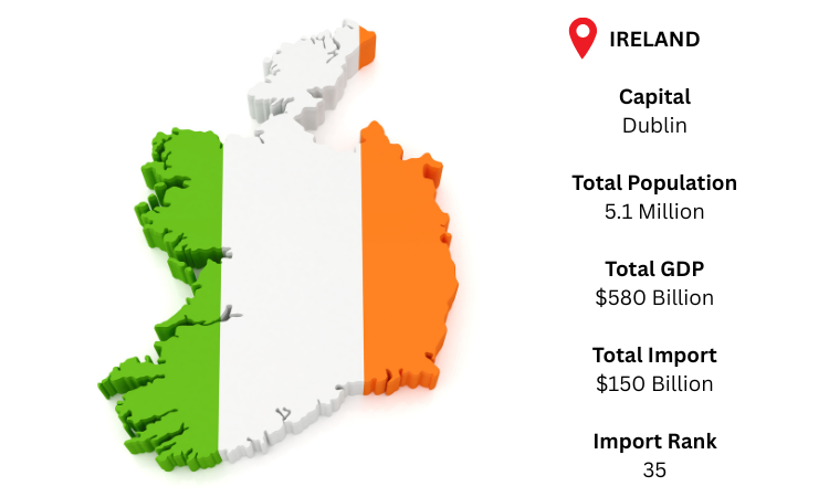 Ireland, a developed island nation in Western Europe, imports essential commodities for its consumer, technological, and pharmaceutical industries, making it heavily dependent on international commerce. The capital, Dublin, serves as the political, economic, and shipping center of the nation. As per Ireland import data, with a population of over 5.1 million and a GDP of almost USD 580 billion, Ireland is expected to import approximately USD 150 billion in 2024, demonstrating its significant position as a major importer in the EU.