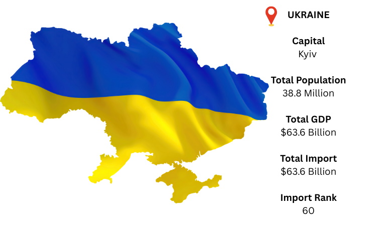 Ukraine is an Eastern European country with a population of about 33 million. The country imported approximately USD 63.6 billion, ranking around 60th globally, reflecting its ongoing industrial demand and reconstruction needs. Its capital is Kyiv. As per Ukraine import data, its import share is USD 63.6 billion, and top import partners include China, Poland, and Germany, and the leading imported products are mineral fuels, vehicles, and electrical machinery.